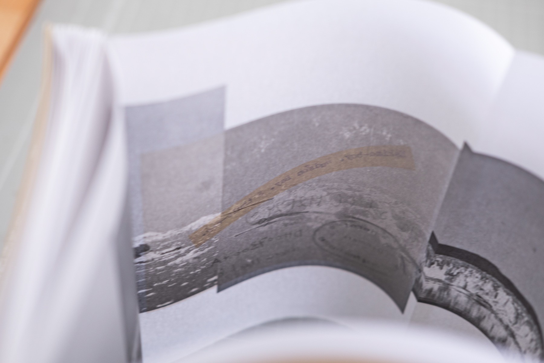 In the book, the fold-out pages with landscape images are printed on the reverse side – or perhaps more accurately, the inside, as these pages are bound such that they can be folded out to form a circle that provides a 360-degree horizon. The paper is thin, which means that the photos of landscapes and the photos of the reverse sides intermingle.