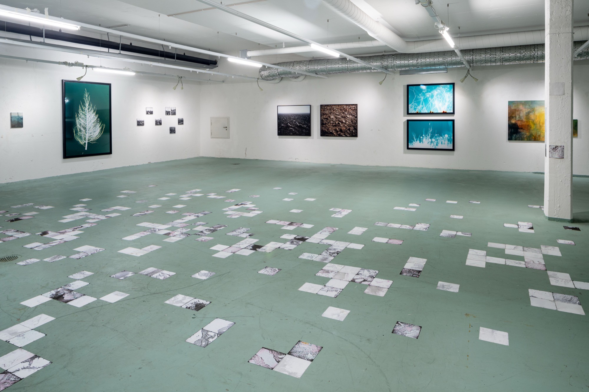 The images captured during this process are for this artwork printed on limestone paper, and the ink is manipulated to convey the landscape's sense of disintegration. As a result, visitors to the exhibition find it challenging to avoid walking on the images, adding a layer of physical engagement to the experience.